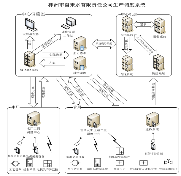 本系統(tǒng)由我司與湖南華億電子工程有限公司共同策劃實施。項目充分利用日益發(fā)展成熟的計算機信息技術(shù)、3G通信技術(shù)和自動控制技術(shù),結(jié)合統(tǒng)計、預(yù)測、數(shù)學(xué)模型、空間分析等手段,對公司經(jīng)濟(jì)、技術(shù)指標(biāo)和管網(wǎng)實時運轉(zhuǎn)情況進(jìn)行反饋控制,實現(xiàn)對供水調(diào)度各工作環(huán)節(jié)的合理配置。系統(tǒng)建成后,其功能將在管網(wǎng)的快速準(zhǔn)確監(jiān)控、安全維護(hù)、優(yōu)化設(shè)計以及搶修施工和用戶需求的迅速響應(yīng)等方面表現(xiàn)得尤為突出。