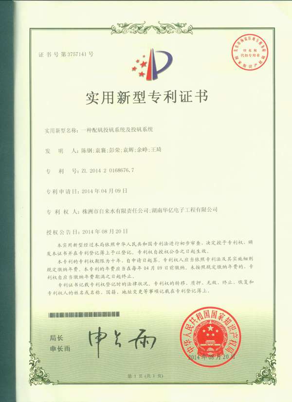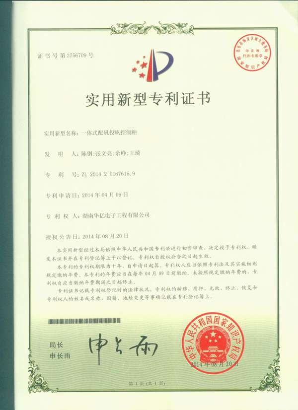 2014年湖南華億電子工程有限公司在各位領導的精心帶領下經過艱苦努力成功研制出“一體式配礬投礬控制柜”、“一種配礬投礬系統(tǒng)及投礬系統(tǒng)”,并獲得兩項專利權,在此祝賀公司又向前邁進了一步,大家辛苦了!公司的前景會越來越光明的!