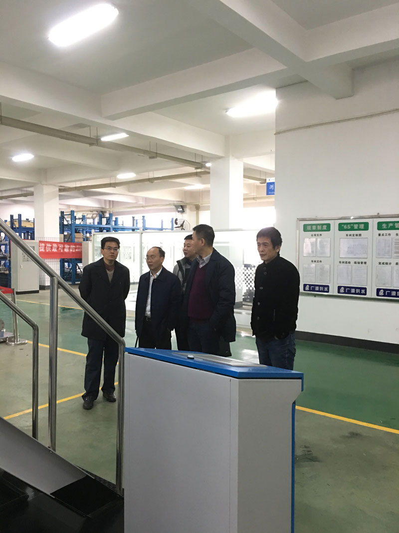 圖為株洲市自來水有限責任公司董事長謝錦輝、總會計師劉國宜親臨設備生產(chǎn)車間視察工作